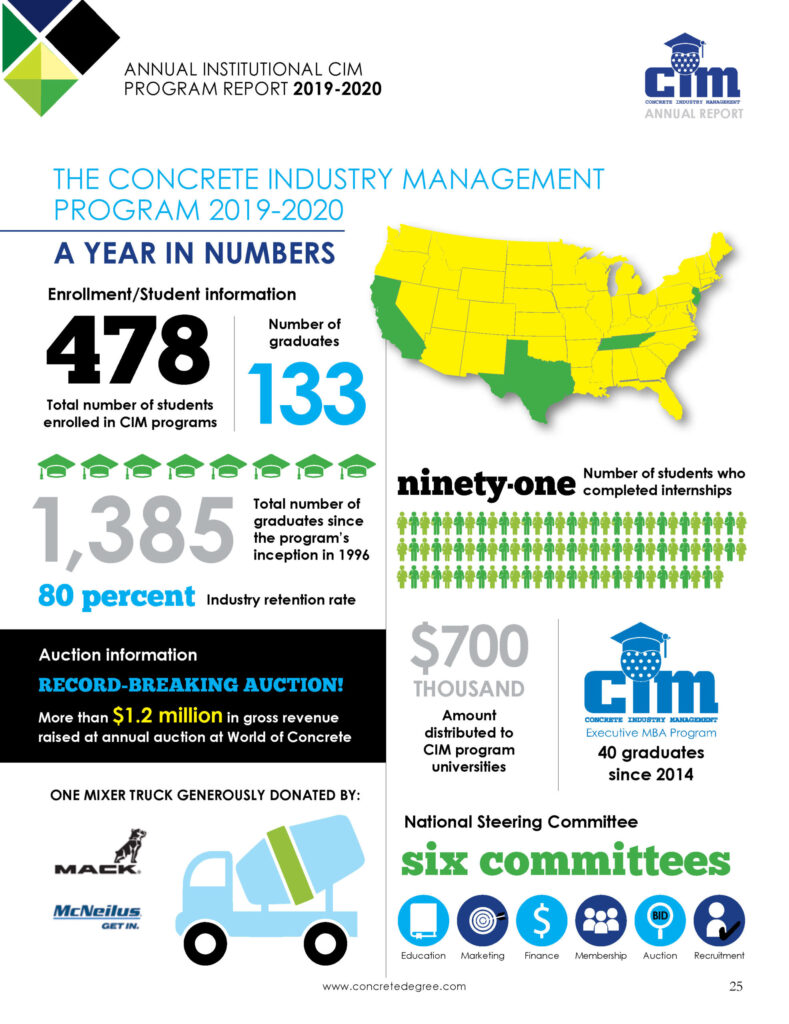 The CIM program is a business intensive program that awards students with a four-year Bachelor of Science degree in Concrete Industry Management. The annual auction is the primary funding source supporting the program, providing scholarships and hands-on industry experiences for CIM majors. The CIM program has five locations: Middle Tennessee State University, New Jersey Institute of Technology, Texas State University, California State University – Chico, and the CIM MBA Program.
