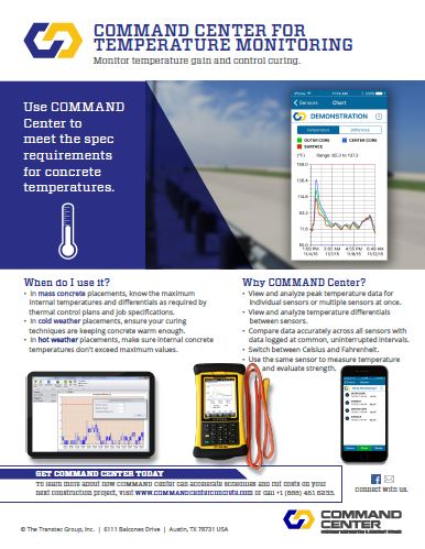 Instead, contractors can use maturity monitoring to reliably estimate their in-place concrete’s strength based on measured data at the job site. By embedding COMMAND Center™ sensors in the concrete after placement, concrete strength can be estimated from the internal temperature history of the actual project’s concrete.